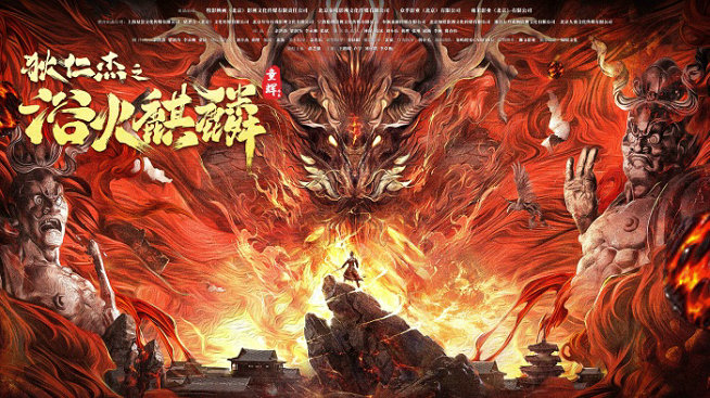 影片开机当天,官方首次曝光概念海报。整张海报被红彤彤的烈火充斥,耀眼的红色给人强烈的视觉冲击。画面里一只暴走的神兽麒麟从弥漫的大火中探出头颅,正朝着古城民宅喷火,而与这只庞然大物决然对立的是画面下方一个手持亢龙锏的男人,强弱力量的对比悬殊,突显出男人面对凶兽的凛然。两侧的尊像瞠目而视,刻画出凶兽麒麟祸害人间时的天怒人怨,令人更加期待这部影片。